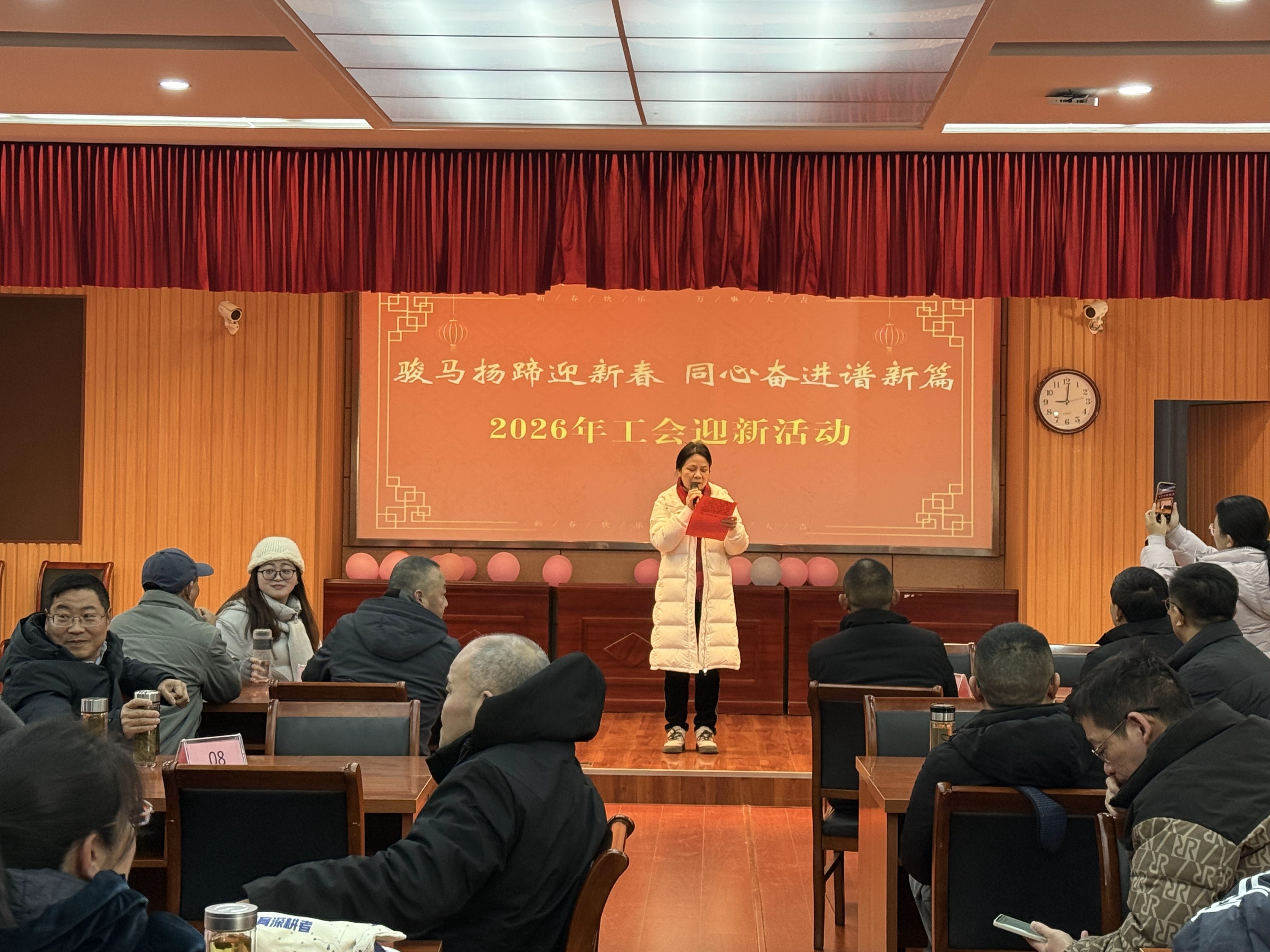 活动伊始,校党委书记陈庆玲代表学校党委向辛勤工作在各个岗位的全体教职工致以诚挚问候和新春祝福,对工会精心组织此次富有特色的迎新活动表示充分肯定。她指出,过去一年学校各项事业取得了显著进展,这些成绩凝聚着每一位教职工的智慧与汗水。她强调,2026年是学校发展的关键之年,希望全体教职工继续保持昂扬向上的精神风貌,将活动中展现的团结协作、奋勇争先的精神转化为推动工作的强大动力,共同为开创安庆开放大学高质量发展新局面作出新的更大贡献。